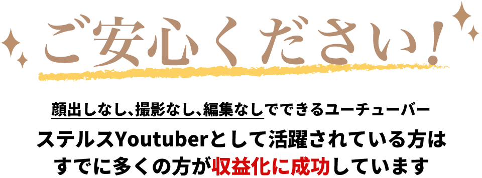 もちろん副業としても活躍できます。 スキマ時間でも実践可能なのがステルスYoutuberの魅力の一つでもあります。 副業で始めて収入が大きくなってから独立される方も多いです。